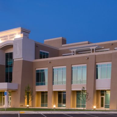 All state-of-the-art court security features are incorporated into the new 50,000 sf facility that is located on a prominent site at Highway 314 in Los Lunas. The building design features a contemporary Pueblo Style design with spaces organized around a three-story atrium, shaded balconies, a formal courthouse lawn and secure parking for Judges, staff and jurors.